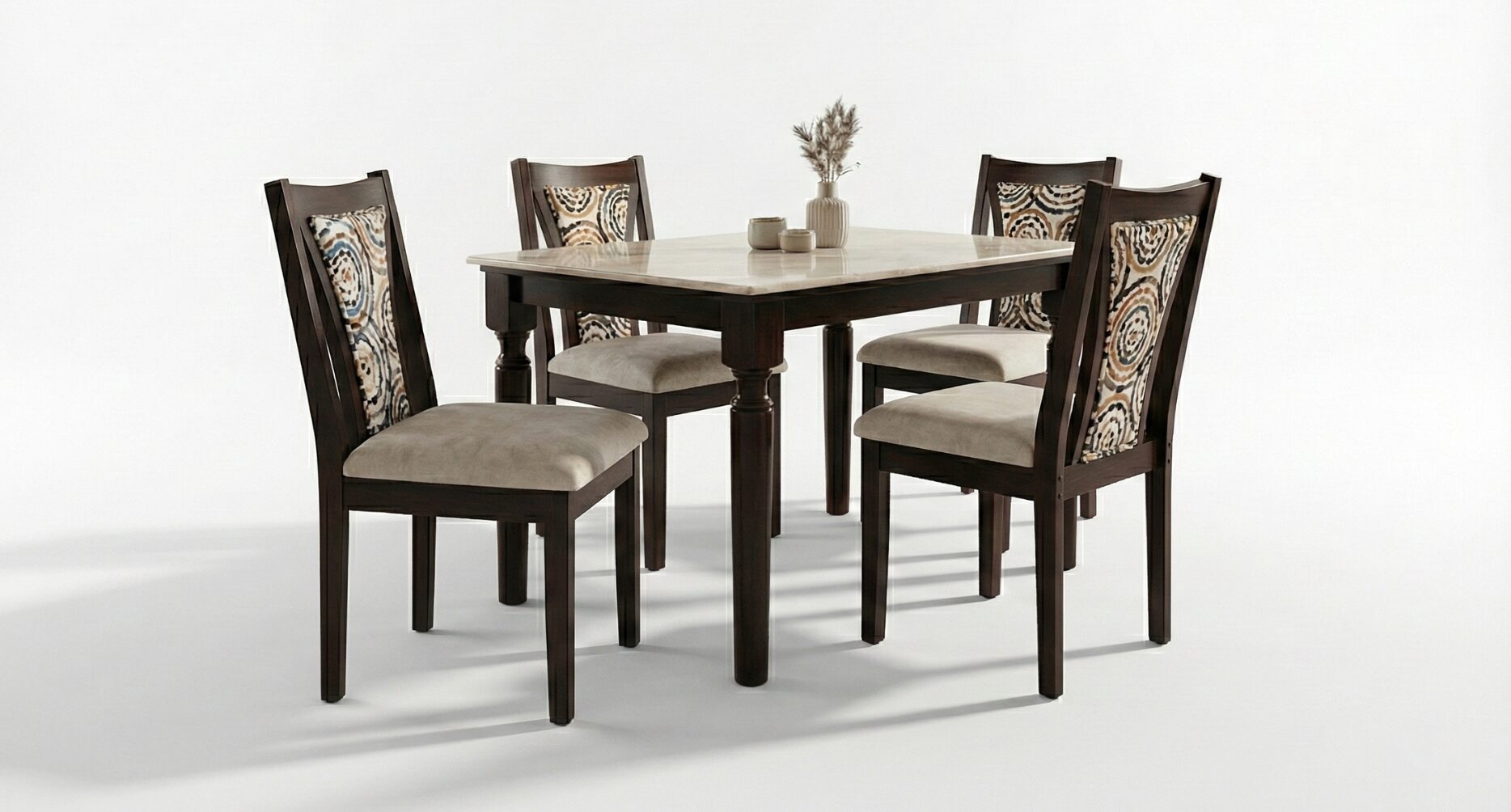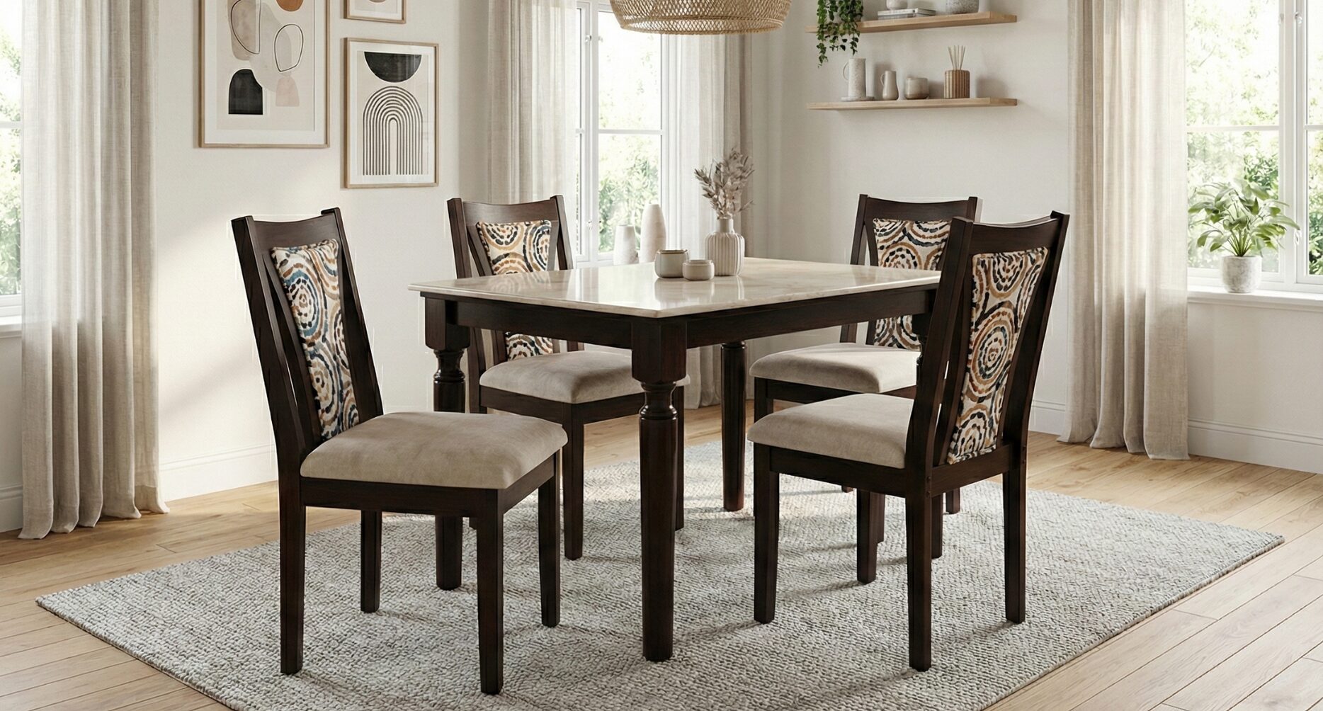 The spacious tabletop provides a smooth, easy-to-maintain surface, ideal for daily meals as well as special occasions. Accompanied by four beautifully crafted chairs, the set ensures superior comfort with cushioned seats and ergonomically designed backrests, highlighted by elegant fabric detailing that adds a touch of sophistication.