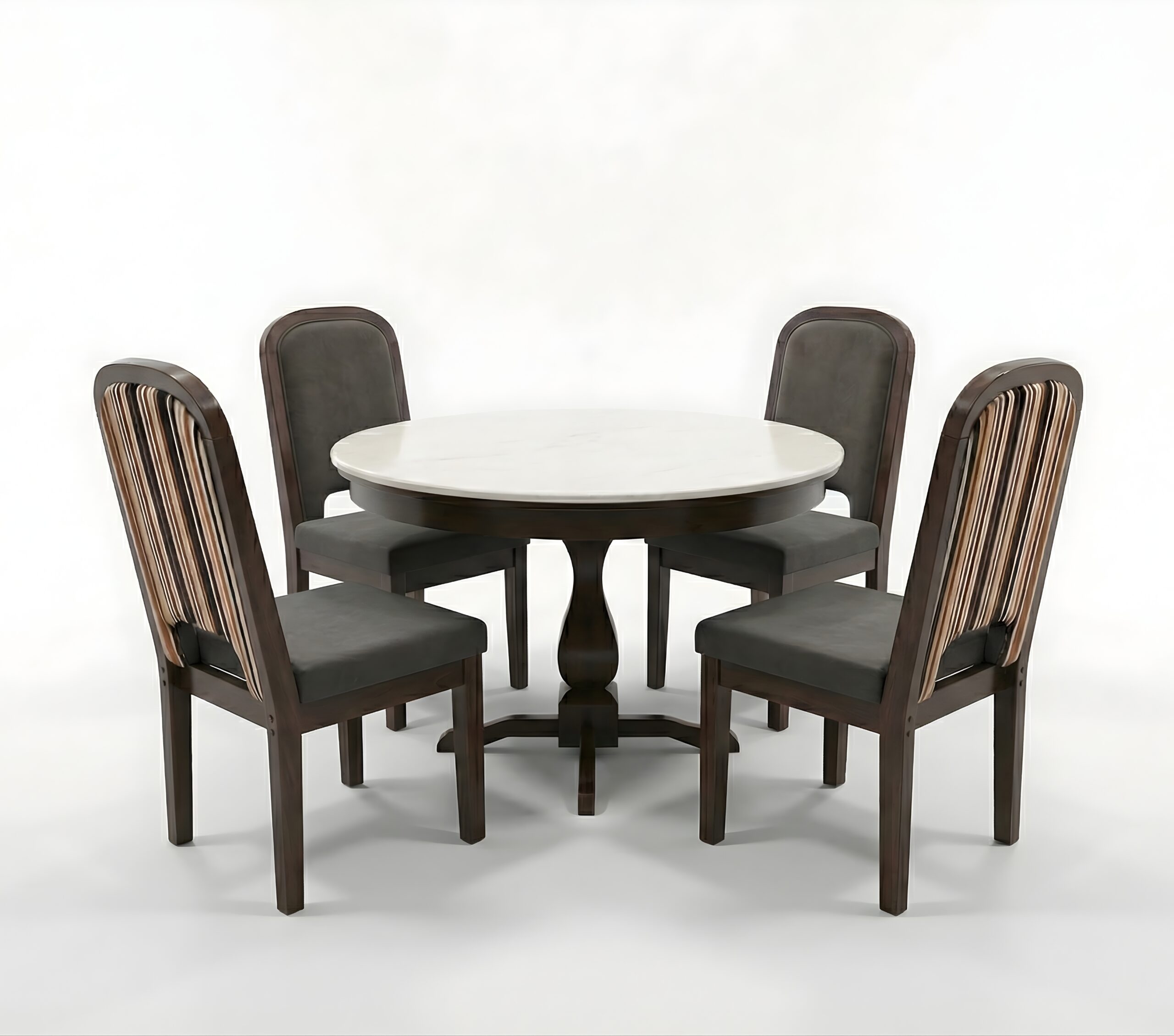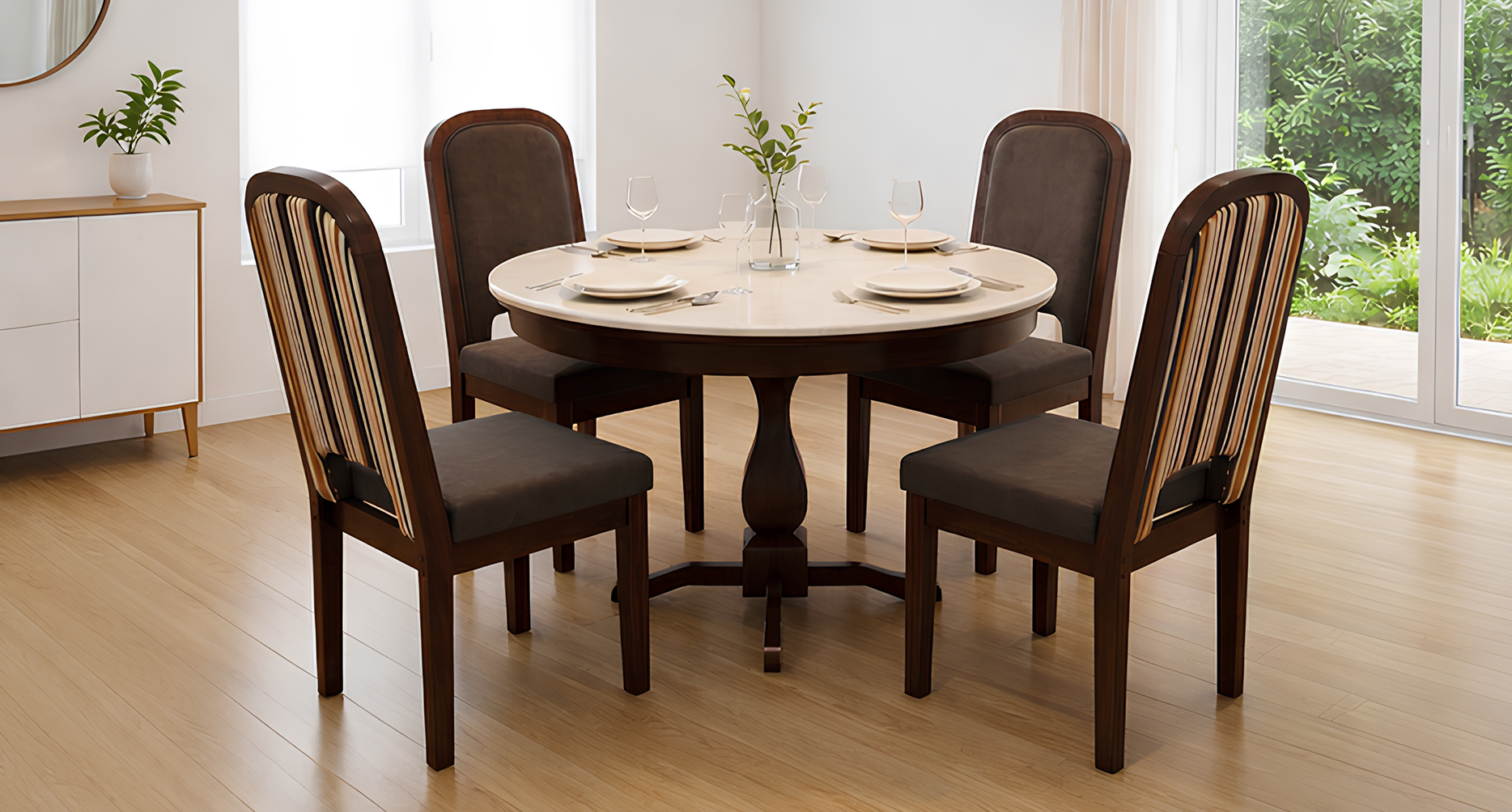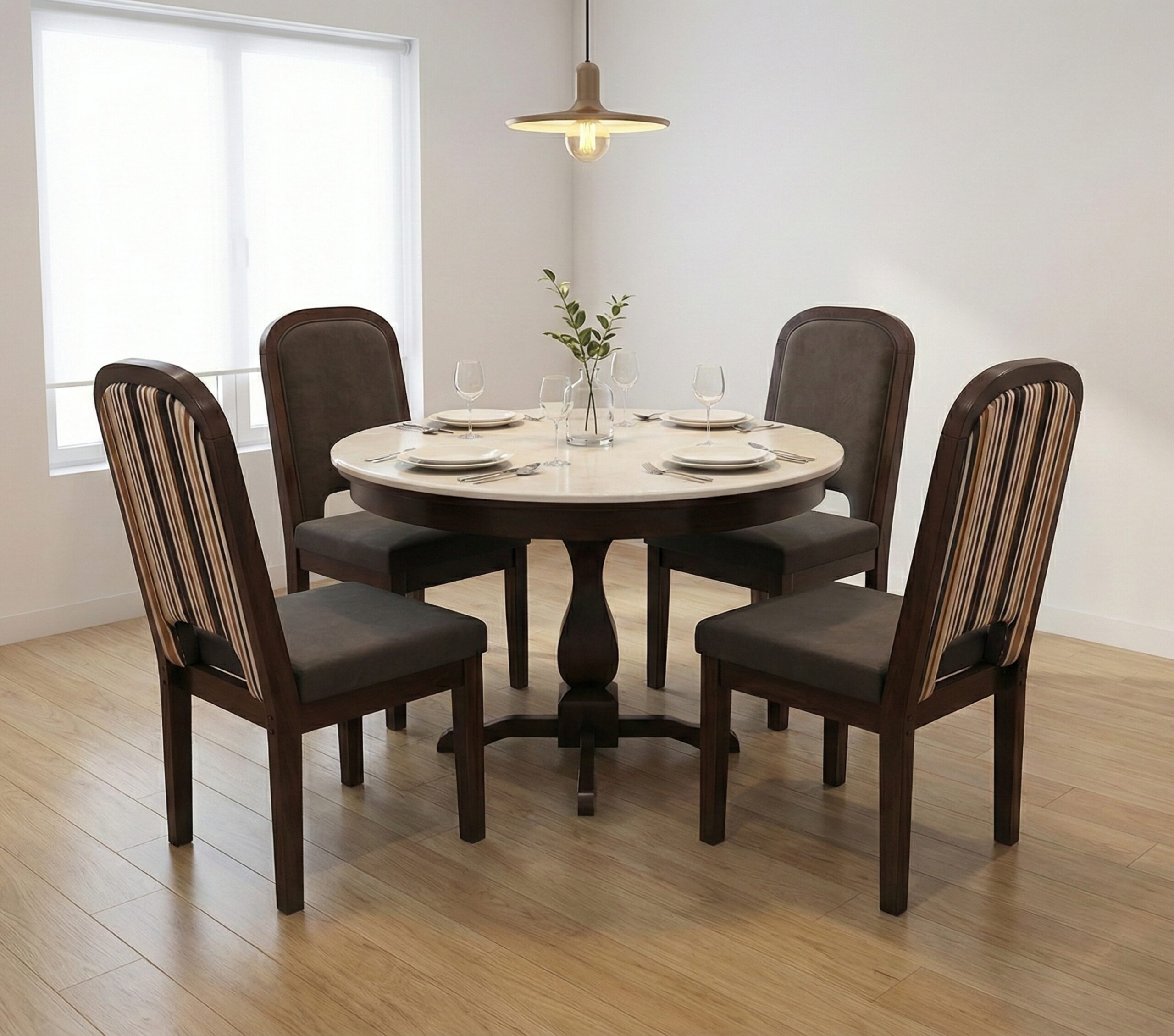 The sturdy round table is perfectly complemented by four ergonomically designed chairs, crafted for comfortable seating and long-lasting use. The chairs feature a strong wooden frame with cushioned seats and supportive backrests, making them ideal for daily meals as well as special gatherings.