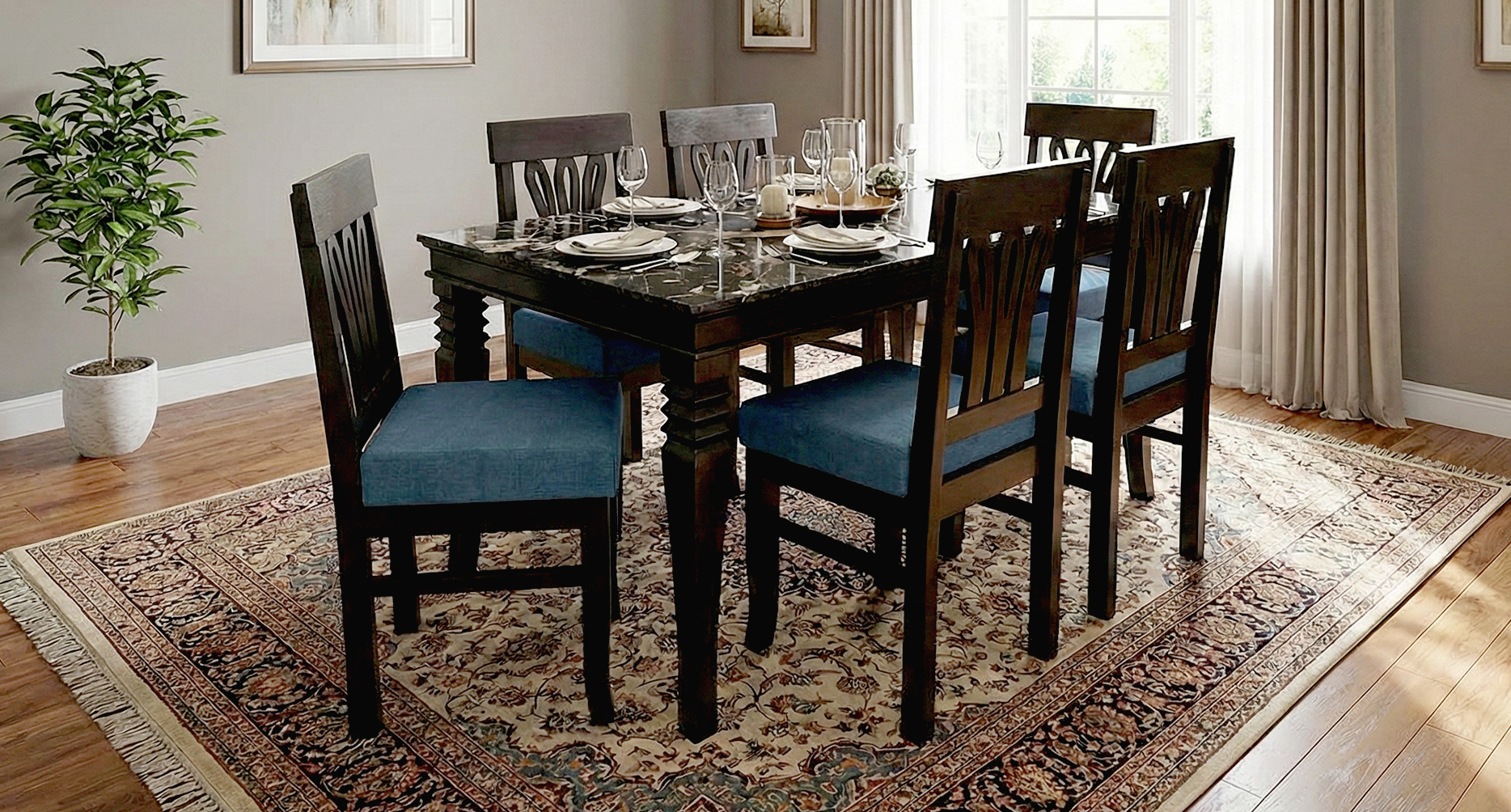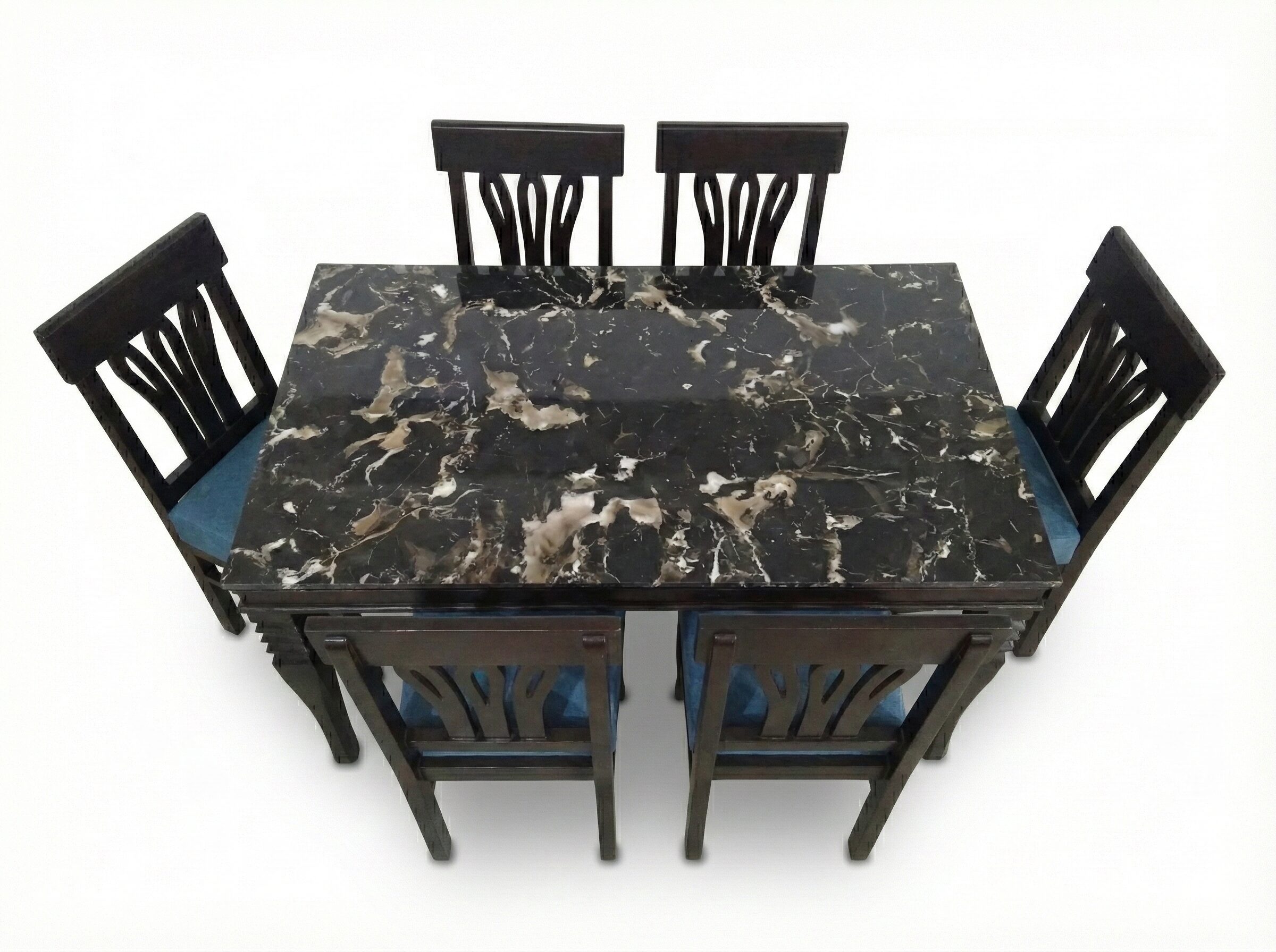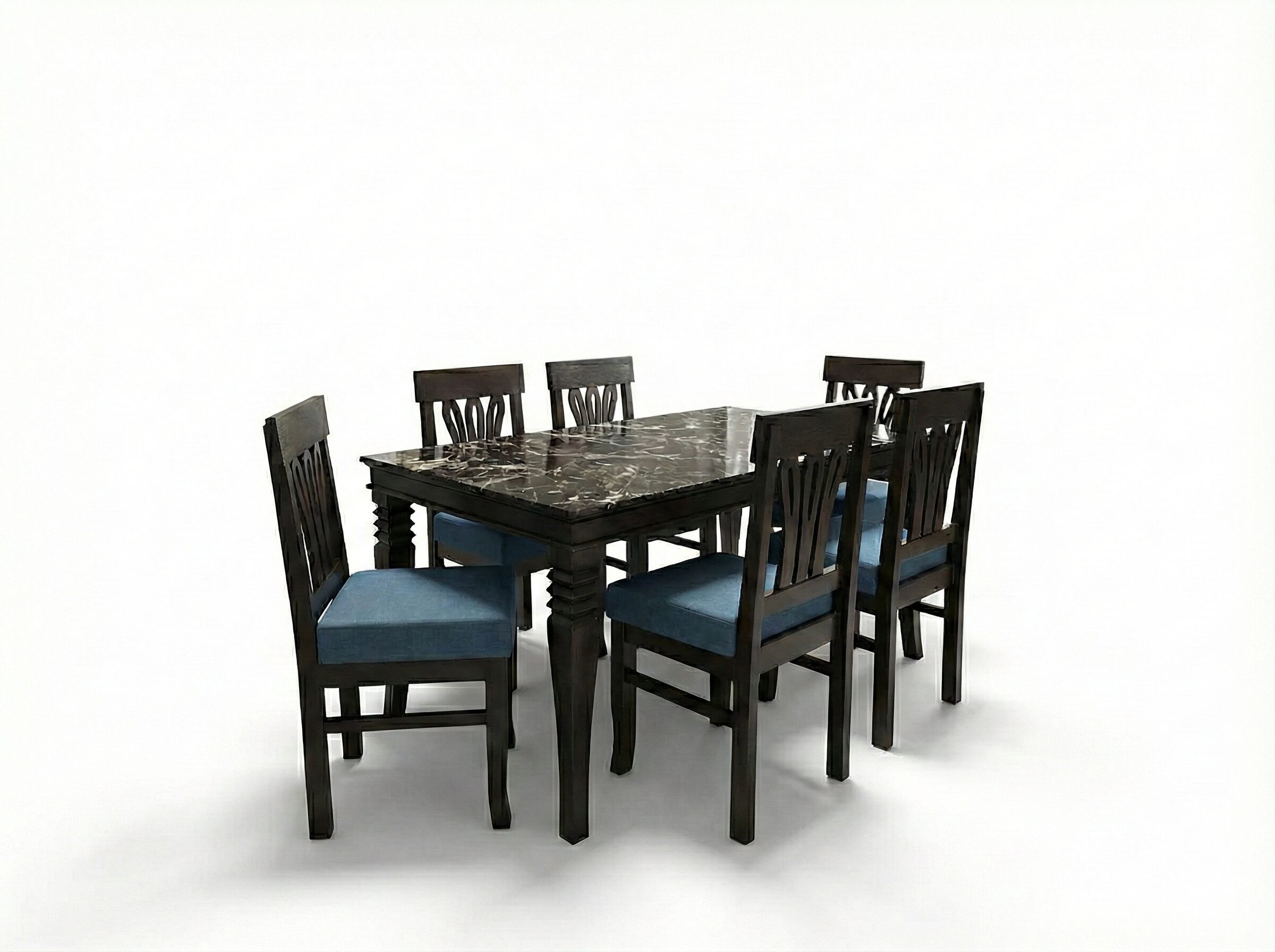The beautifully polished marble surface adds a sophisticated touch while ensuring easy maintenance and long-lasting performance. The sturdy frame provides excellent stability, and the six ergonomically designed chairs come with comfortable cushioned seating for relaxed and enjoyable dining moments.
