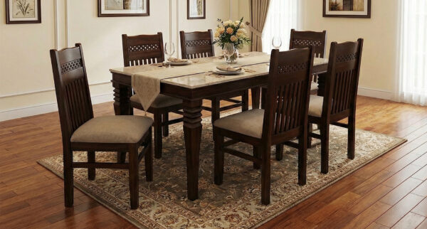 The beautifully polished marble surface adds a sophisticated touch while ensuring easy maintenance and long-lasting performance. The sturdy frame provides excellent stability, and the six ergonomically designed chairs come with comfortable cushioned seating for relaxed and enjoyable dining moments.