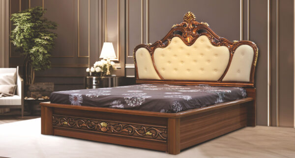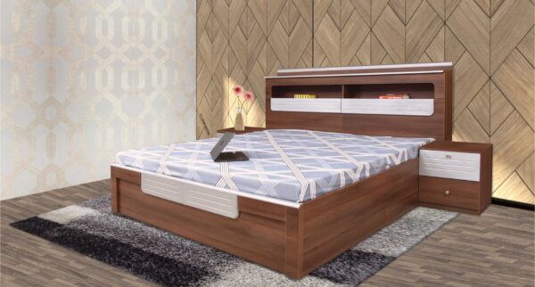 - Moon Hydraulic Bed is your comfort zone. Moon bed is designed with cushion headboard keeping in mind comfort and utility. Minimal in design, it is thoughtfully crafted to last long. The storage space is useful to keep all your extra belongings safely. It’s divided into two compartments for easy organization and access. This sturdy bed is the perfect choice for quality sleep.